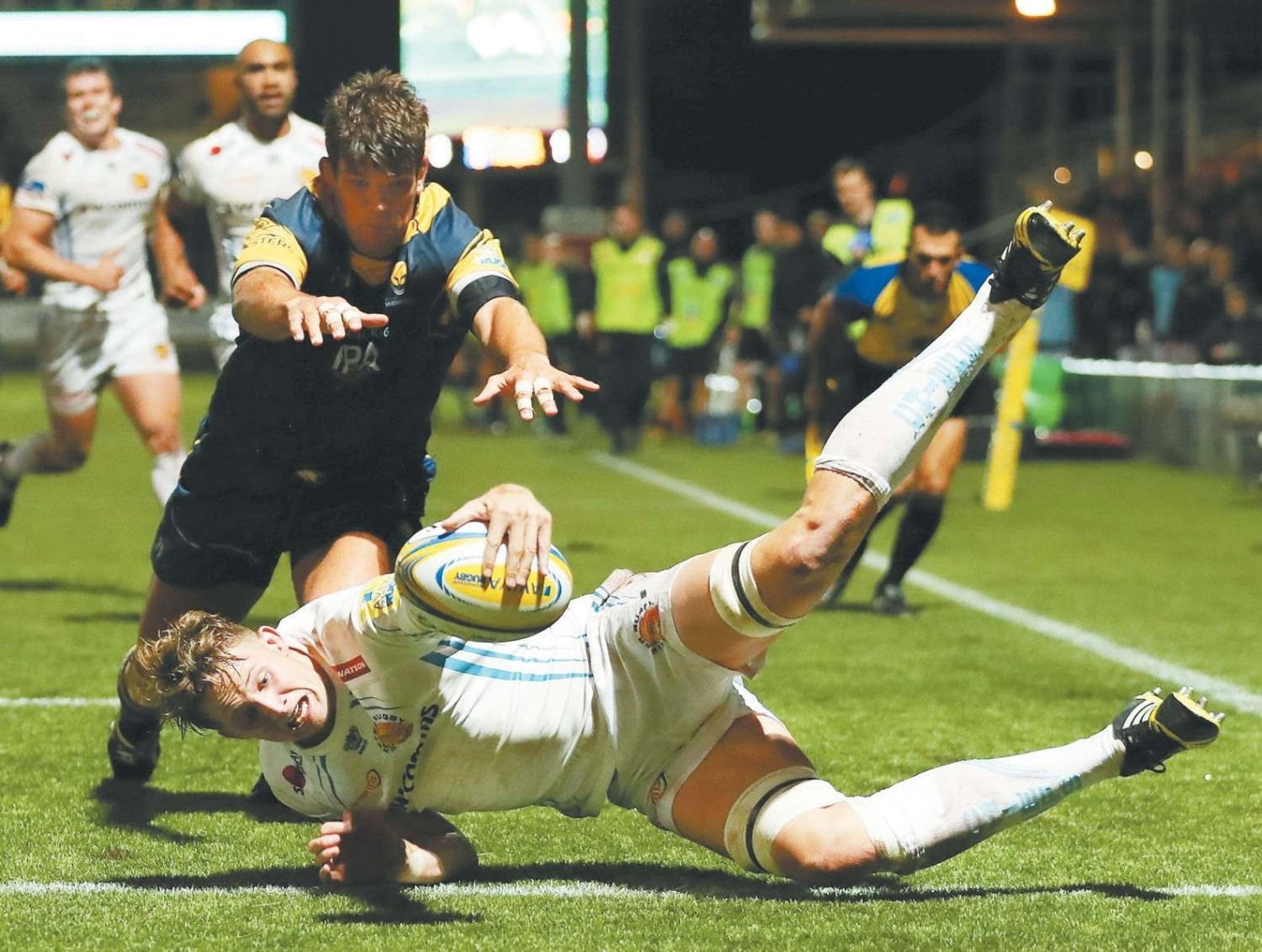 Easing the pain: Jonny Hill scores in Exeter’s victory over Worcester on Friday night