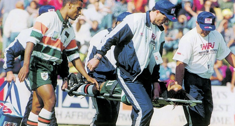 Injury: Max Brito is carried from the field during the 1995 World Cup