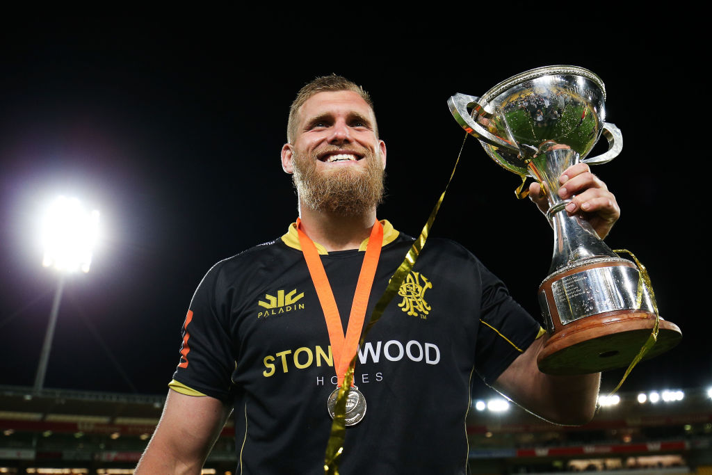 Incoming from Wellington: Brad Shields holds the Mitre 10 Cup after beating Bay of Plenty in the 2017 final (Photo: Hagen Hopkins/Getty Images)