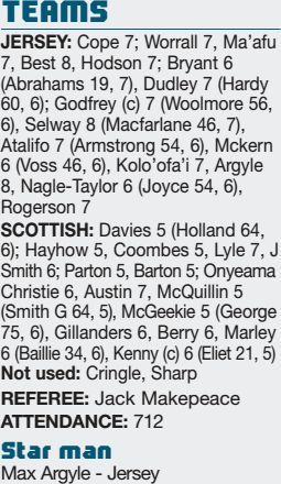 By TOM INNES Jersey 45 L Scottish 10 JERSEY maintained their 100 per cent record after three rounds with a commanding...