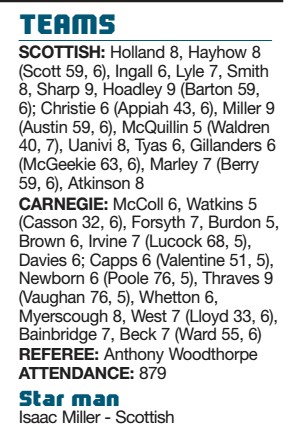 By LUKE JARMYN L Scottish 29 Y Carnegie 19 NICK Scott returned from injury to slide over for the Exiles’ first...