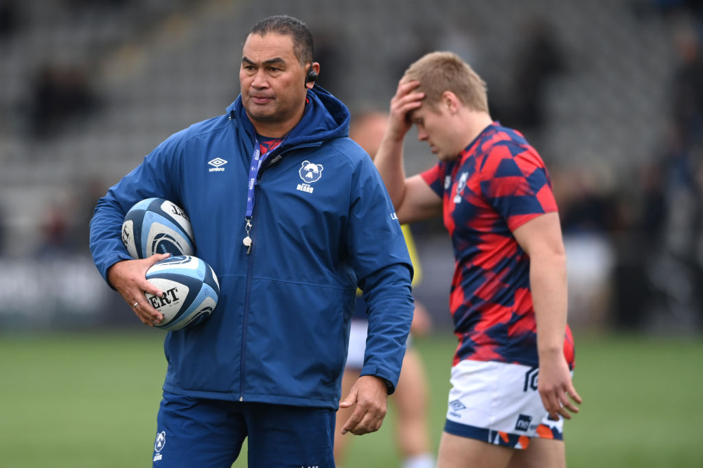 NEWCASTLE UPON TYNE, ENGLAND – OCTOBER 16: Bristol head coach Pat Lam looks on during the warm up during the Gallagher Premiership Rugby match between and at Kingston Park on October 16, 2021 in Newcastle upon Tyne, England. (Photo by Stu Forster/Getty Images)