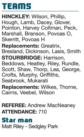 By STEFFAN JAMES Hinckley… 15 Stourbridge… 7 TWO first-half tries from Hinckley meant that they secured their 12th win of the...