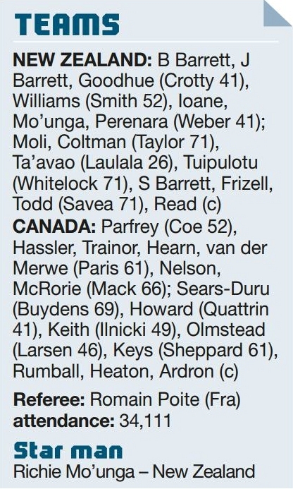 New Zealand…63 Canada……………0 NEW Zealand scored nine tries to record their second convincing win. Brothers Beauden, Jordie and Scott Barrett all...