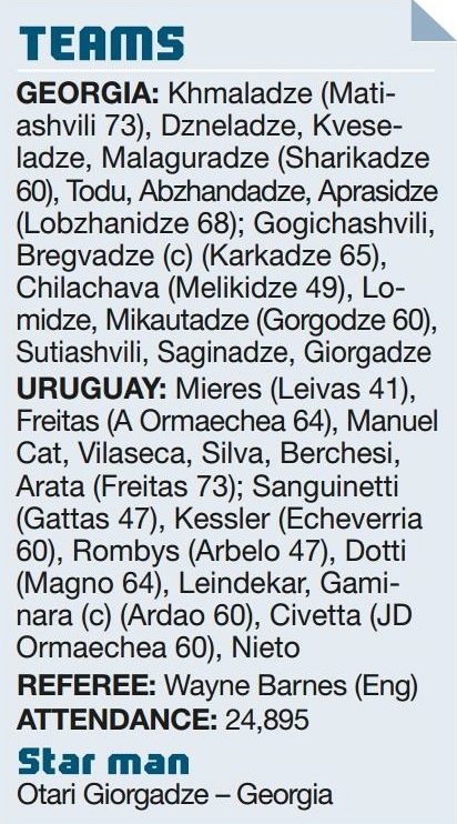Georgia……………33 Uruguay……………7 GEORGIA scored five tries to bring Uruguay crashing down to earth at Kumagaya Stadium following the South Americans’ shock...