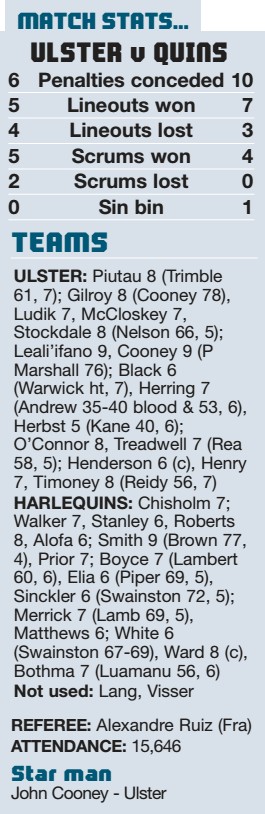 By RONAN O’BRIEN European Champions Cup JOHN Cooney scored 27 points as six-try Ulster punished Harlequins late on at Kingspan Stadium...