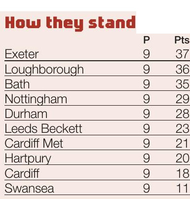 League leaders Exeter fell to defeat to Nottingham 42-26, a second consecutive home loss as their unbeaten form has slipped away, with pressure applied after Loughborough’s 56-7 demolition of Durham. Loughborough shut out Palatinate for 70 minutes scoring eight tries from 7-0 down adding six tries in the second half to go one point behind Exeter with an Archie Kean brace the headline.