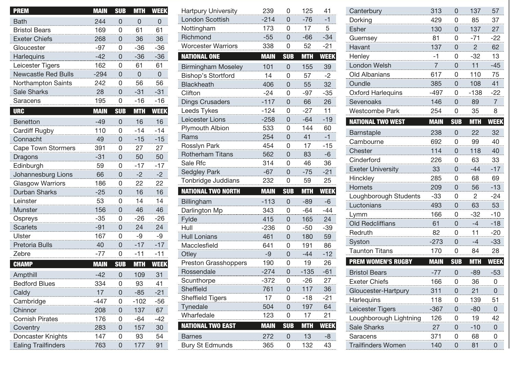 FANTASY RUGBY TEAM TOTALS