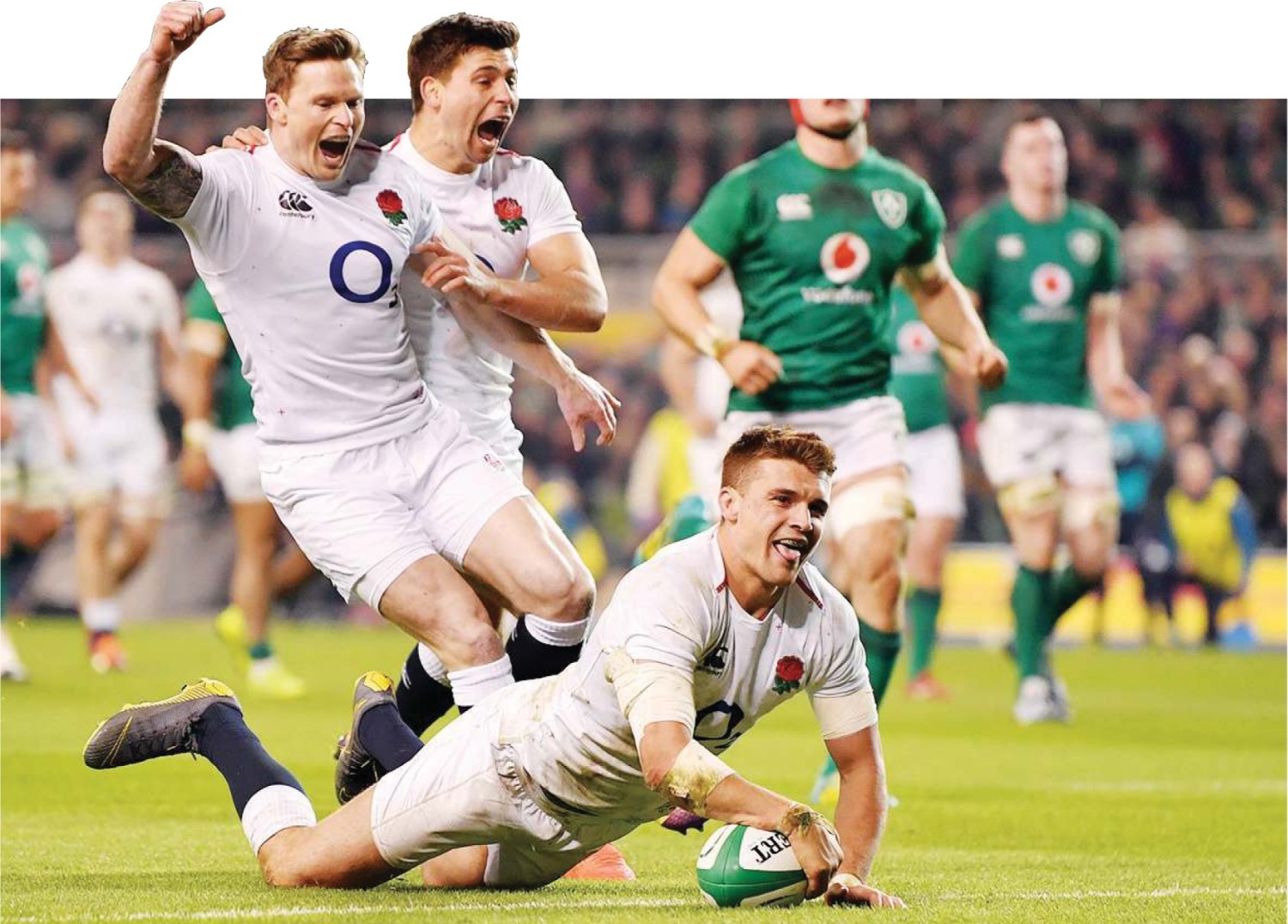 ■By SAM JACKSON Got it licked: Henry Slade crosses to score England’s fourth try against Ireland to the delight of his...