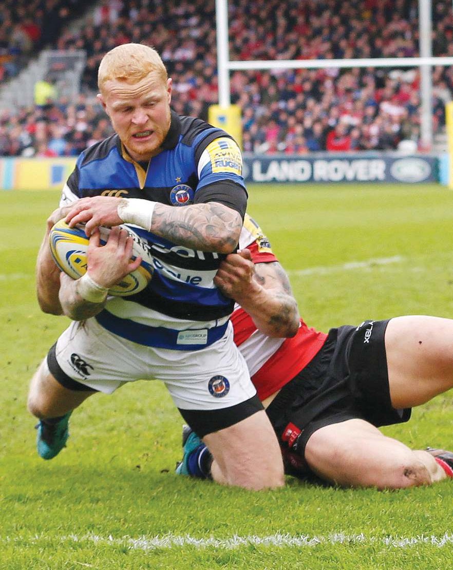By NICK CAIN Bragging rights: Tom Homer finishes his 60 metre run to score Bath’s fourth try in the derby win...