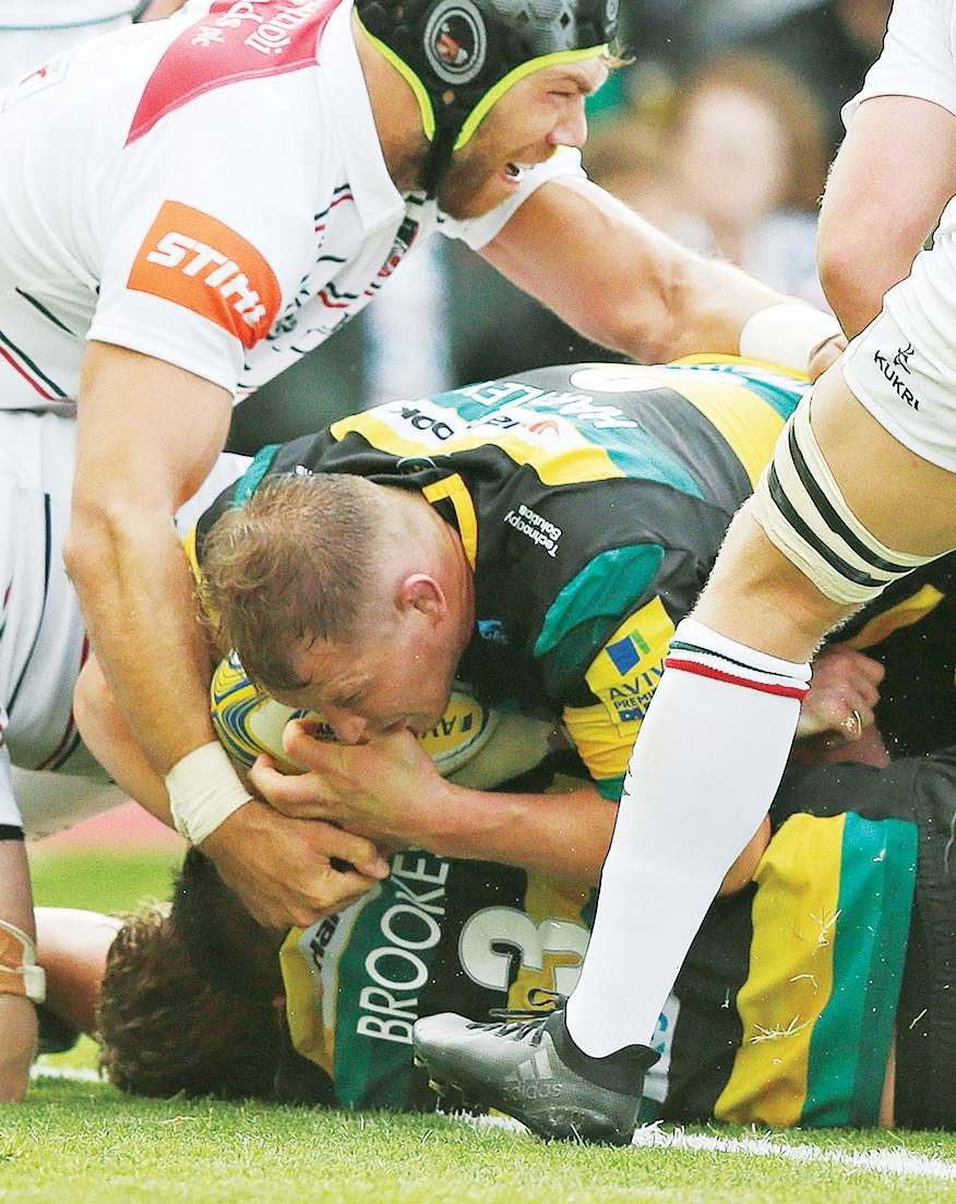 By NEALE HARVEY Leading by example: Saints captain Dylan Hartley goes over for a try to stun Leicester PICTURE: Getty Images...