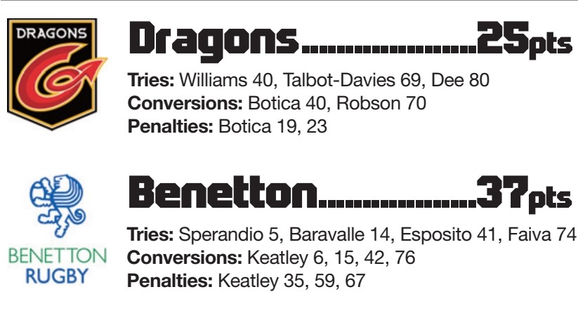 By STEFFAN THOMAS UNDERSTRENGTH Dragons were outmuscled by Benetton and fell to their first defeat at Rodney Parade since November. The...