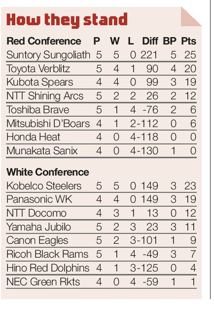 JAPAN ROUND-UP By MATT MCILRAITH THE Kobelco Steelers extended their unbeaten run to 18 games after outclassing Yamaha Jubilo 53-22. Wayne Smith’s...