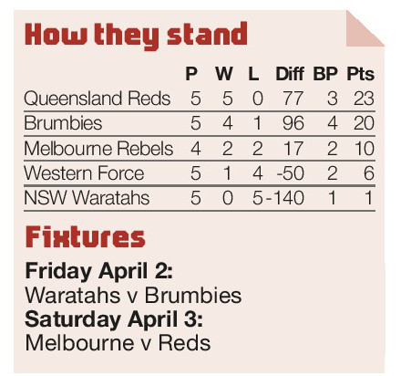 AUSTRALIA ROUND-UP By ADAM ELLIS THE REDS regained top spot in Super Rugby AU with a 46-14 victory that condemned the Waratahs...