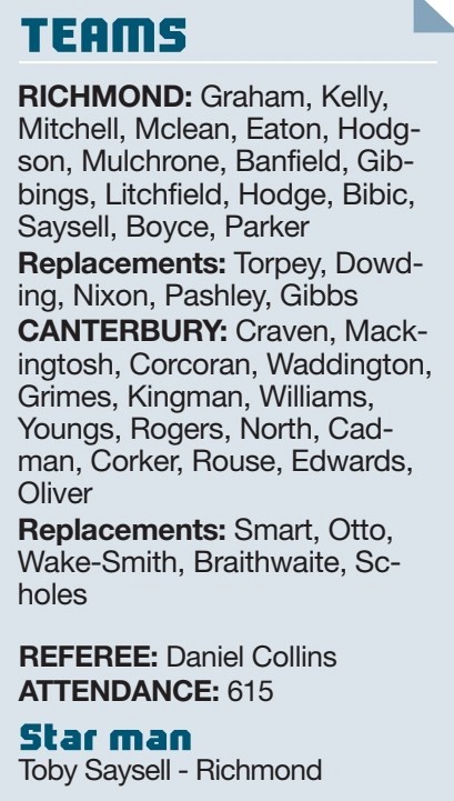 ■By TIM FORRESTER Richmond……27 Canterbury……10 LOWLY Canterbury briefly held a two-point lead against Richmond but the league leaders were stung into...