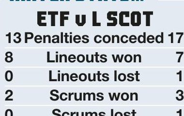 ■By BLUEBELL NICHOLLS L Scottish ........ 34pts Tries: Clayton 5, 38; Law 56, Ferdinand 78 Conversions: Kerr 6, 39; Bellamy 57,...