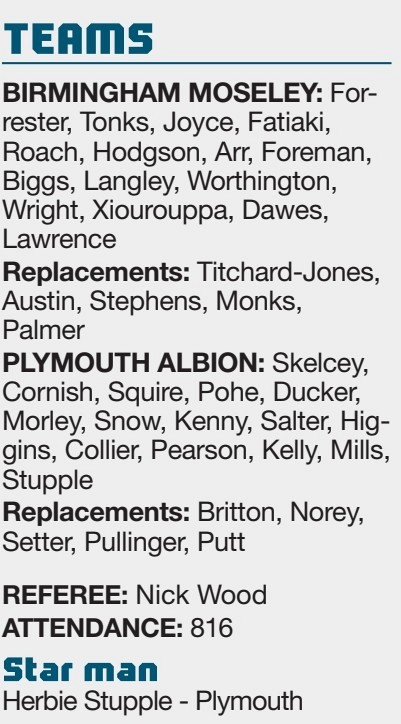 By PATRICK MARSH Plymouth Albion............ 12pts Tries: Jones 30, Collier 40 Conversion: Putt 40 Bishop’s Stortford....... 24pts Tries: Moore 1, 28,...