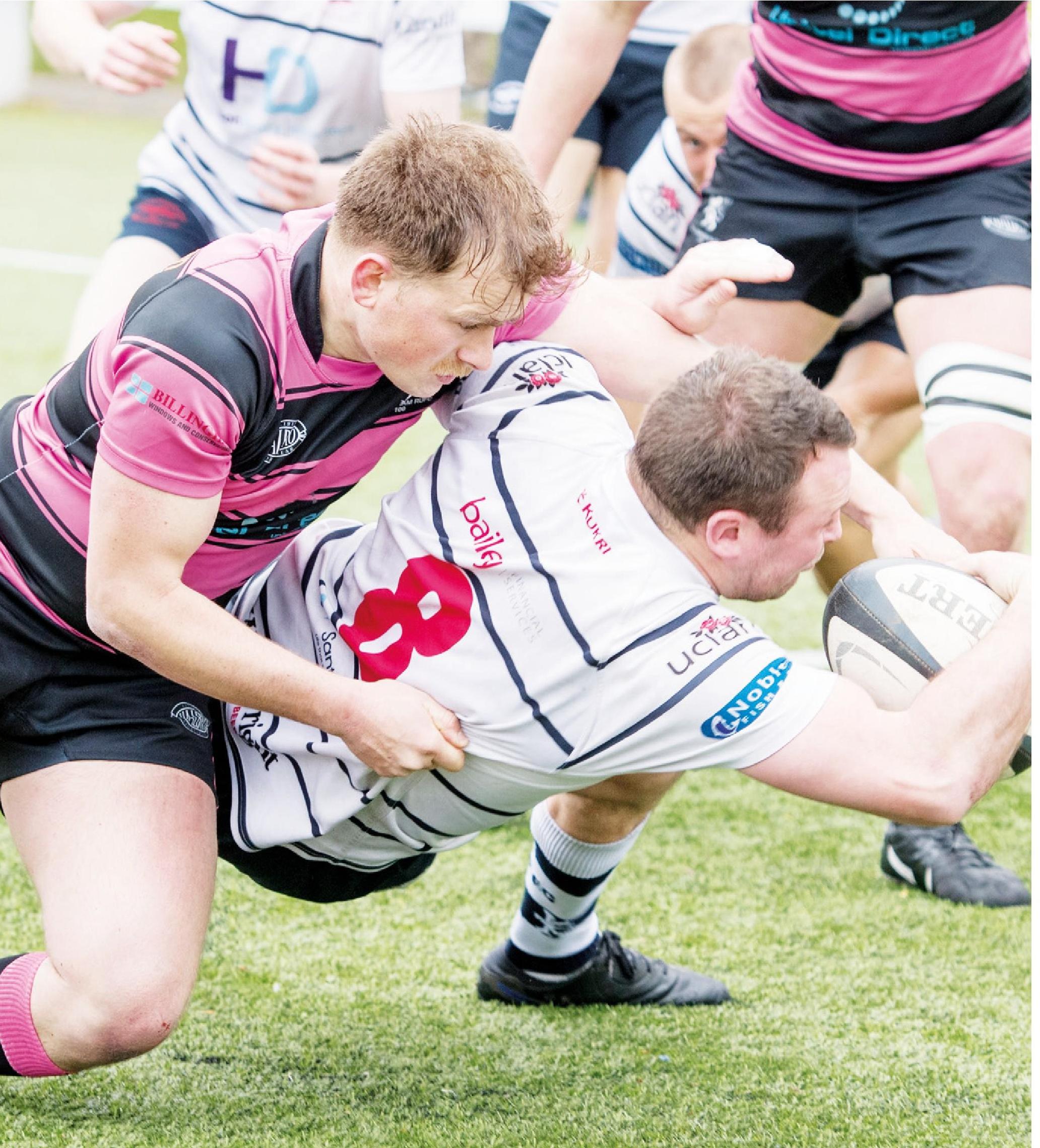 By TOM KELLY Preston Grass..38pts Harrogate..........31pts Touching down: Ed Keohane extends the lead for Preston and, below, Grasshoppers look to spread...
