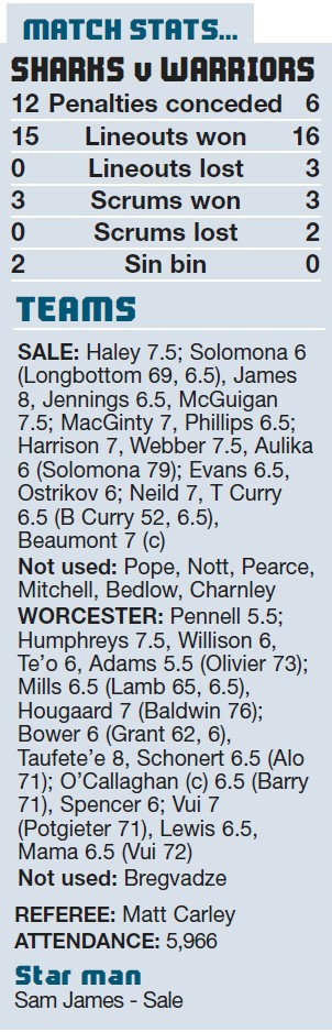 By COLIN NEWBOULT Sale Sharks…36pts Tries: James 7, 28, Haley 39, McGuigan 64, B Curry 77 Conversions: MacGinty 8, 29, 40,...